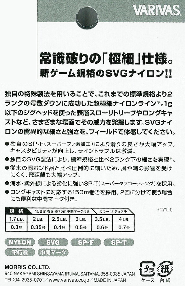 新ゲーム規格のSVGナイロン!! 独自の特殊製法を用いることで、これまでの標準規格より2ランク号数ダウンに成功した超極細ナイロンライン(当社比)。